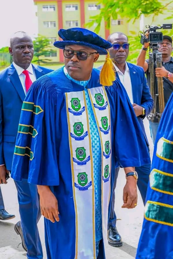 On arrival, Governor Fubara was received at the university ceremonial arena by the Vice-Chancellor, Prof. Isaac Zeb-Obipi, who conducted him through the lineup of academic dignitaries before the procession commenced.